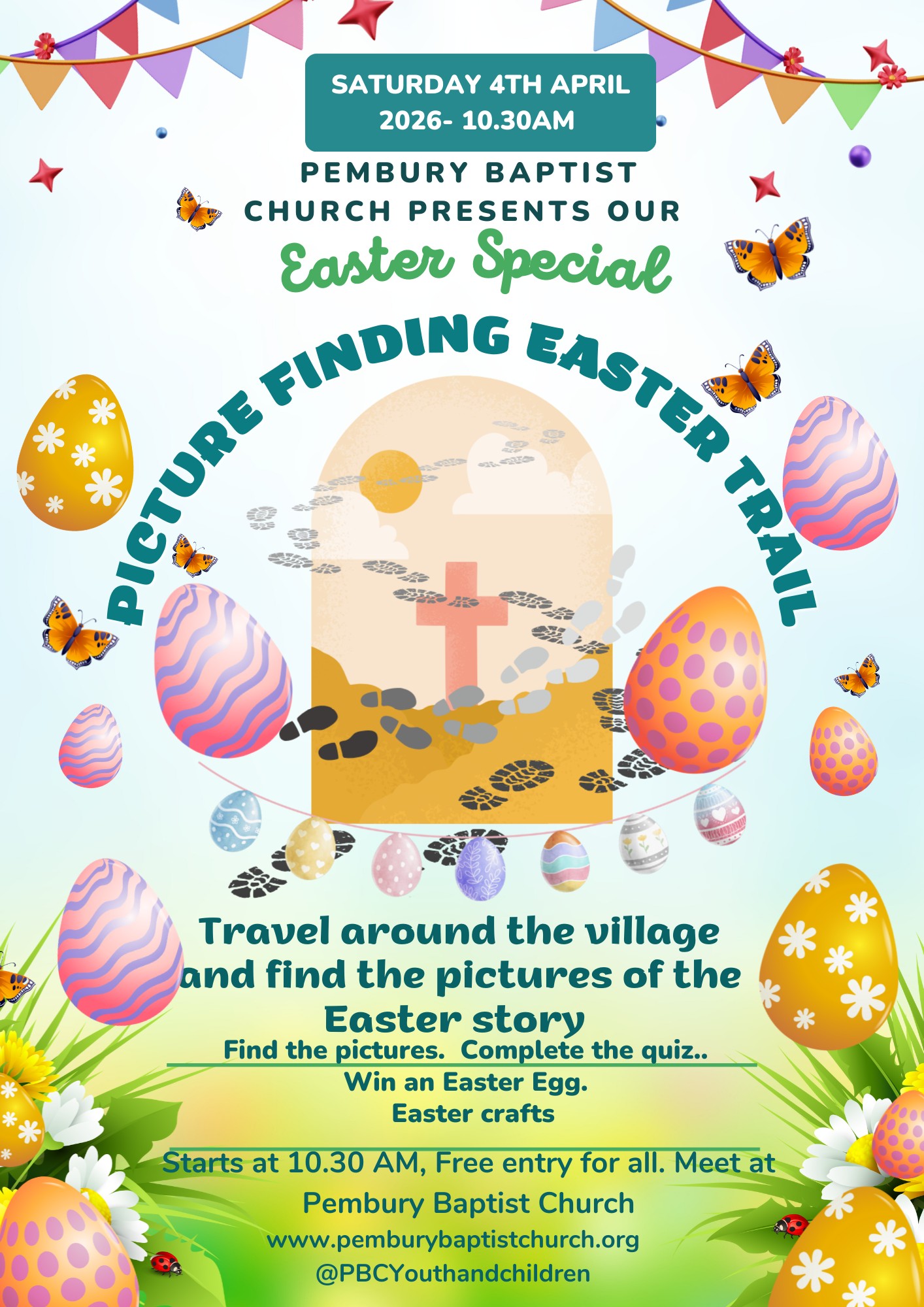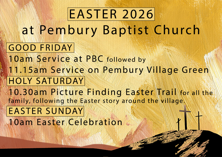 On Holy Saturday 4th April , start at Pembury Baptist Church at 10.30am with all your family and friends and follow the Easter Picture Trail around the village, learning again of the Easter story, then return to the church for chocolate and refreshments!
